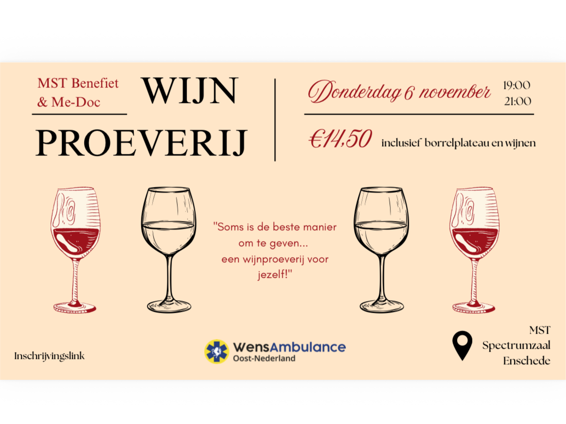 In samenwerking met Me-Doc hebben wij dit jaar weer een heerlijke wijnproeverij georganiseerd. Deze zal 6 november a.s. plaatsvinden in het MST Enschede. Kom jij ook?